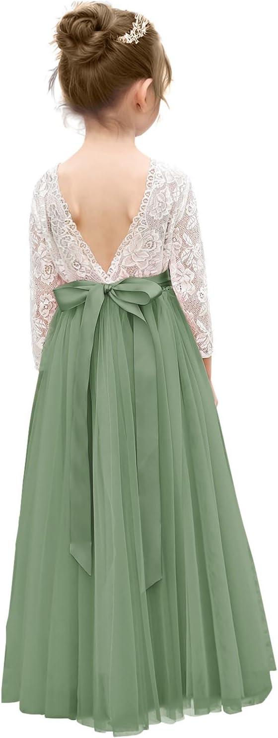 Abaowedding Lace V-Back Flower Girl Dress Tutu Tulle Princess Party Dress with Satin Sash(Sage Green)